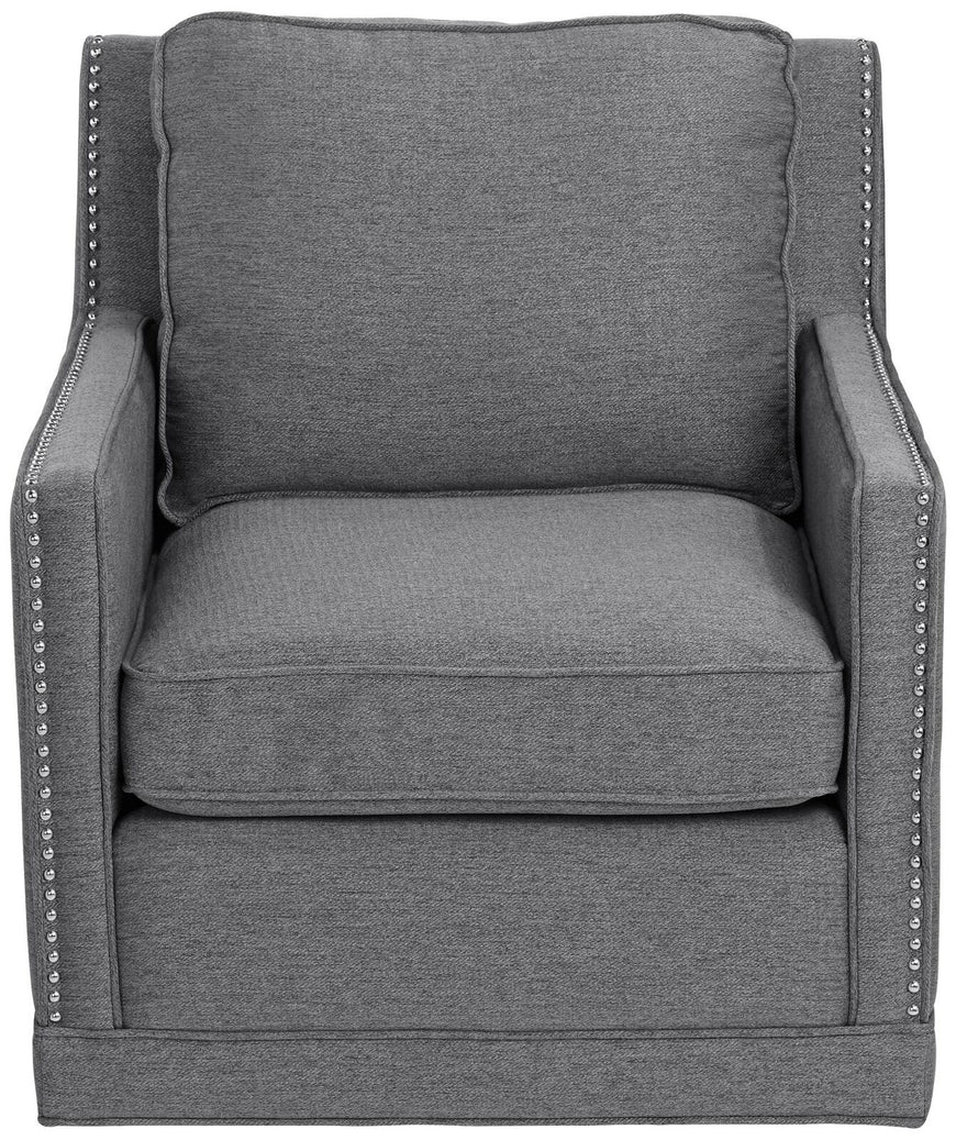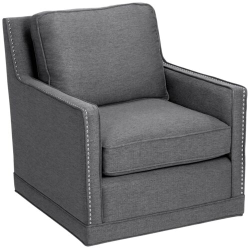 Add comfort to your home with this mica gray linen upholstered swivel chair. Ideal as a reading chair or as an addition to a living room seating area, the design has a full 360-degree swivel base, making getting in and our of it easy. Arms and seat back edge are accented with hand-applied nail head trim.