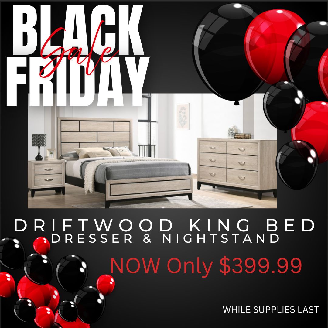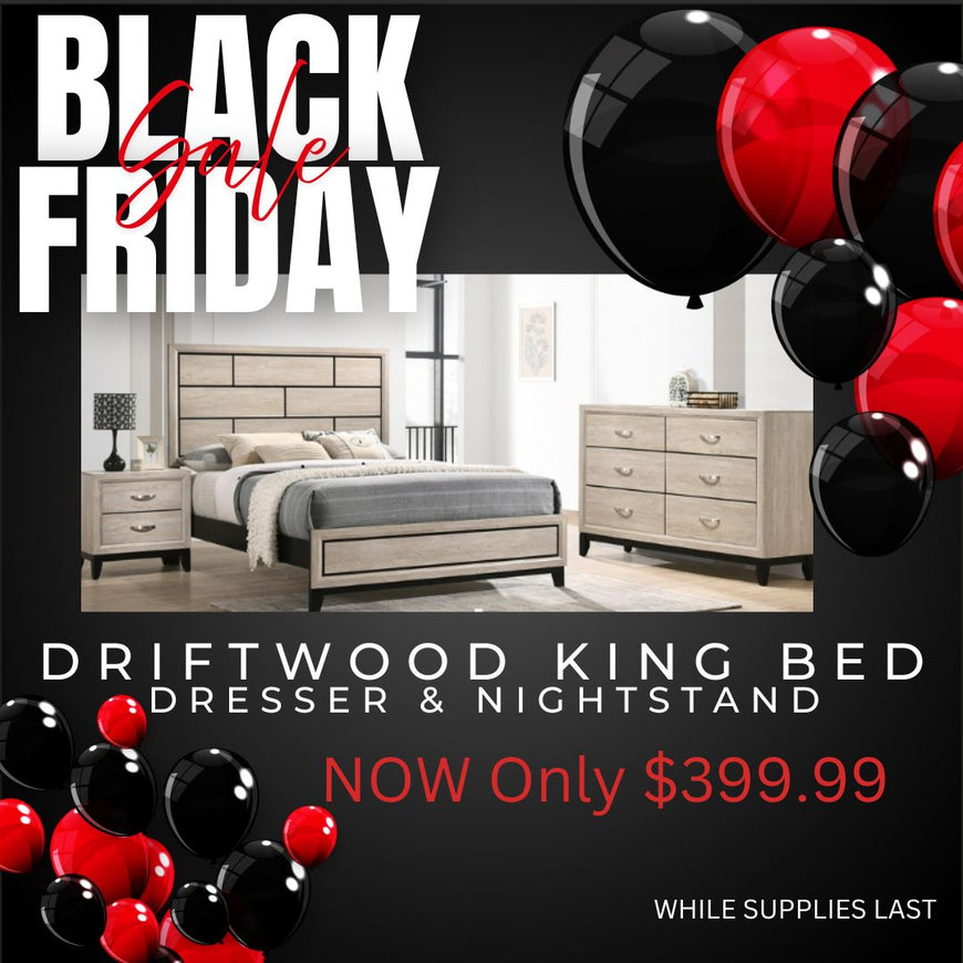 Set includes: King Headboard, Footboard, Rail, Dresser & Nightstand.
