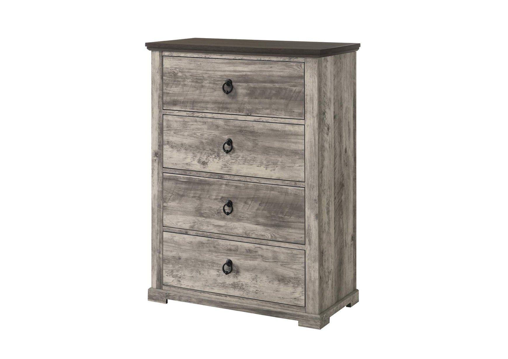 The Ella Mae Chest will surely make a statement in your bedroom. It features five drawers with ring pulls, and comes in a distressed beige finish with a brown top.