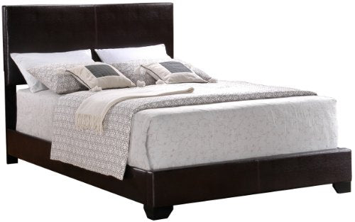 Plush, rich, and stately in design, this upholstered platform bed adds a fantastic sleeping centerpiece choice for the bedroom in your home. Featuring slightly tapered block style legs, with a faux leather upholstery over the entirety of this piece, with seam detailing and geometric lines and edges with a low profile platform base, this bed is completely distinctive in design, and adds powerful styling to any bedroom in your home. This bed can be a sleek addition to any bedroom in your home, from youth, to guest, to master bedrooms, this bed is fashionable and functional in design.