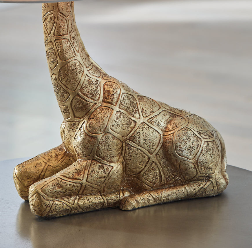 This giraffe lamp combines contemporary style with eclectic charm. The curious animal peeks out over the top of the shade, adding a playful touch to the safari-inspired vibe. For glam appeal, a goldtone finish completes the look. Made of polyresin with drum hardback fabric shade Goldtone finish On-off switch 1...