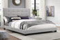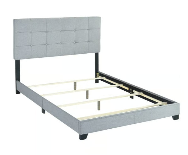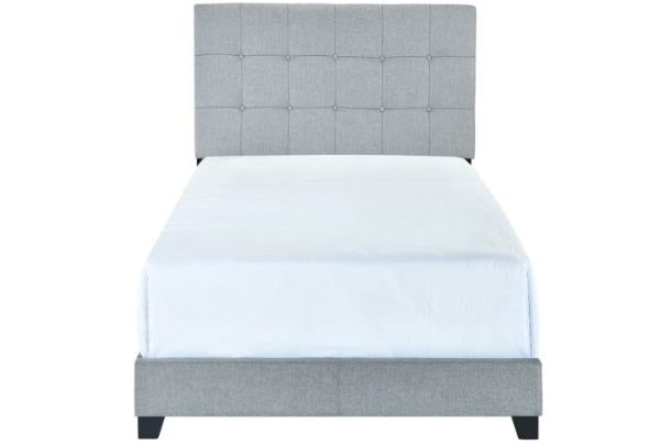 This Twin bed adds an element of sophisticated style to your bedroom. This transitional-style bed displays a high upholstered headboard that complements a low-profile footboard and side rails. Classy button-tufted accents in a square patterned look on the clean, upholstered panel headboard to bring a relaxed, contemporary style to your bedroom space. Founded on a sturdy solid and manufactured wood frame, this grey twin upholstered bed offers functionality and aesthetics at the same time.