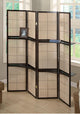 Rich Cappuccino finish folding screen with four panels. Features include wood shelves to personalize space.