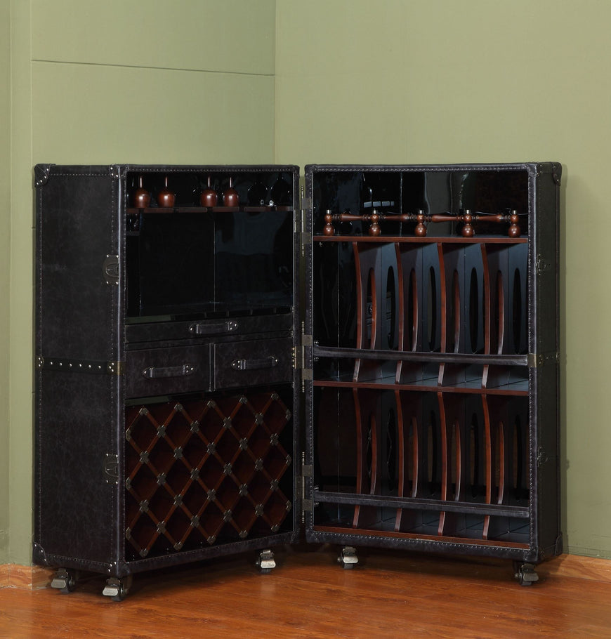 The Gramercy wine cabinet may be slight in stature, but it’s big in function, as is immediately apparent as soon as the piece swings open. On the left side is a rack that holds nearly two dozen wine bottles, topped by a stemware rack plus three handy drawers. On the right of the cabinet is vertical storage for oversized wine bottles, plus additional storage. Beautiful inside and out, the cabinet is covered in premium, top-grain leather with nailhead details and casters for easy mobility.