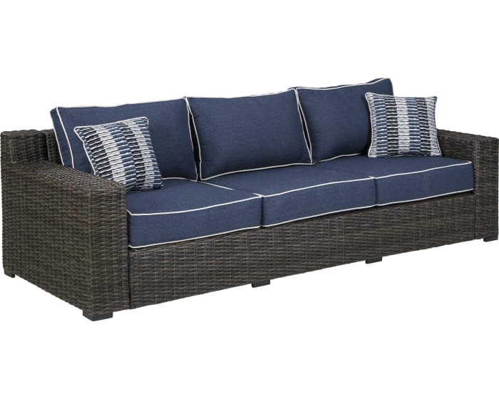 Style. Comfort. Quality. Value. The Grasson Lane sofa with cushion really goes to town, giving you the total package for outstanding outdoor living. Crafted to withstand the elements, this outdoor sofa’s resin wicker base and rust-proof aluminum frame ensure carefree living, while the plush cushion covered in fade-resistant Nuvella® fabric provides stylish appeal. Comfy and casual, it's perfect for use inside or out.