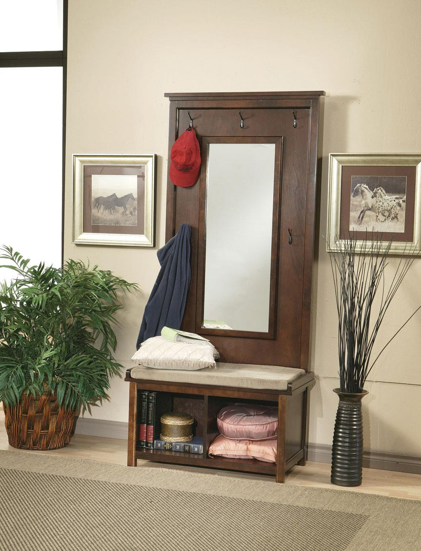 This beautiful dark walnut finished hall tree features a padded cushion seat, two storage compartments at the bottom, coat hooks and a mirror.