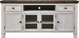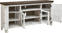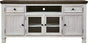 Have your fill of modern farmhouse style with this TV stand. Its distressed two-tone finish pairs a vintage white with a weathered gray for a look that’s utterly charming. Right and left cabinets open to reveal adjustable shelving for all your entertainment center storage needs. Center glass doors add to its relaxed appeal.
