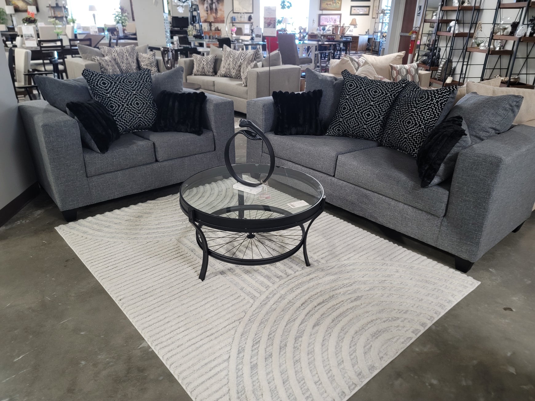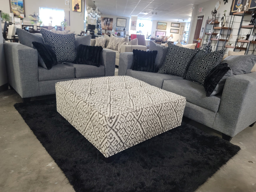 Elevate your living space with this sleek, contemporary sofa and loveseat set designed for both comfort and style. Upholstered in a versatile medium-gray woven fabric, each piece features clean, squared arms and a structured silhouette that complements modern, transitional, or urban interiors. The set is accented with bold black-and-white geometric throw pillows and soft black textured lumbar pillows, adding contrast and visual interest. Deep, supportive seat cushions and plush back cushions provide inviting comfort for everyday lounging or entertaining guests. Sturdy tapered legs offer stability while keeping the look light and modern.