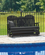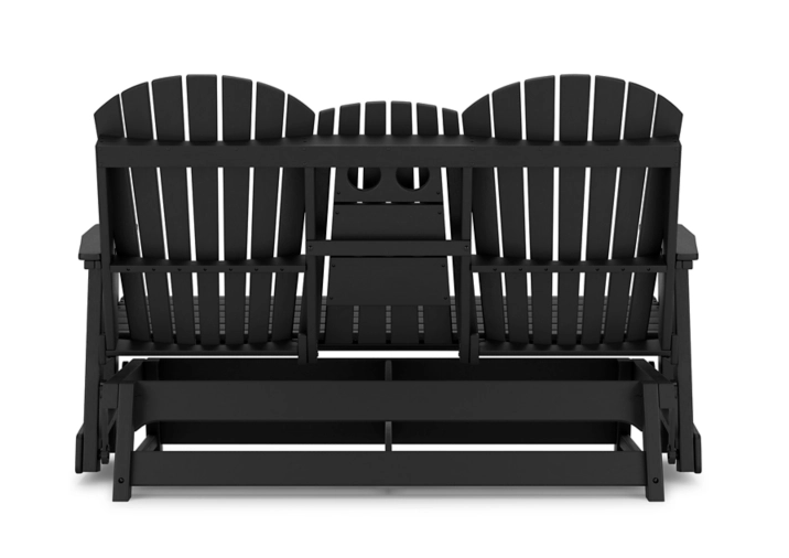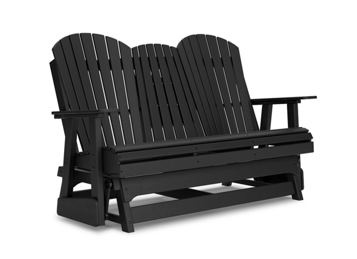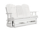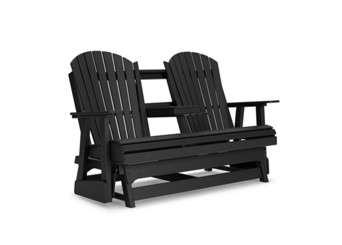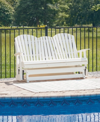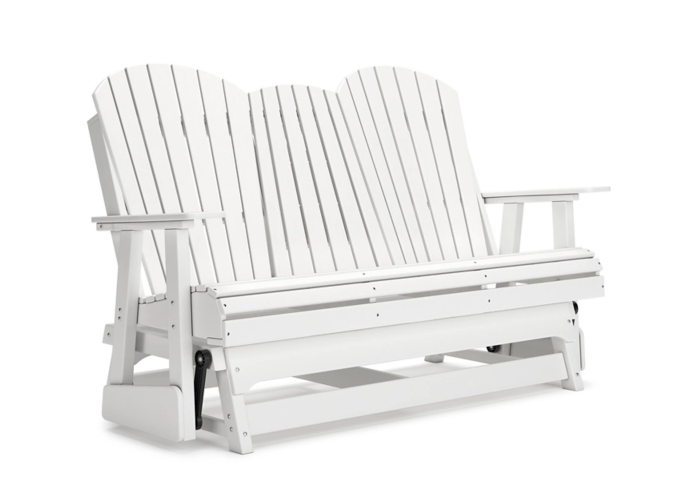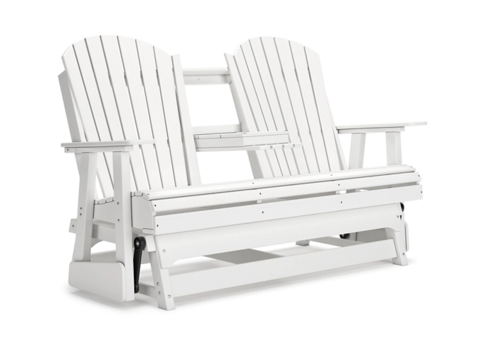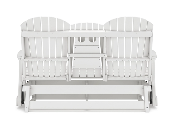 Drift away from everyday worries and into outdoor bliss with this glider loveseat. Dressed in a crisp white, the Adirondack-inspired design has a classic feel. It weathers sunny summer days and cozy winter nights with durable MEGA-TUFF® HDPE material. A drop-down console with integrated cup holders keeps refreshments and snacks within easy reach. With the console snapped into the back, this loveseat has even more room for enjoying lazy days in the shade.