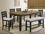 Create a warm and inviting dining space with this beautifully crafted counter-height dining group, perfect for both casual meals and entertaining. The striking two-tone design features a rich, warm woodgrain tabletop that contrasts elegantly with the bold, dark-finished base for a rustic yet modern aesthetic. The sturdy chairs and matching upholstered bench offer plush, tufted seating for comfort, while their ladder-back design adds a classic touch. With its elevated height and spacious surface, this set fosters a relaxed, stylish atmosphere ideal for gathering with family and friends. Durable, versatile, and full of charm, this dining group is a stunning addition to any home.