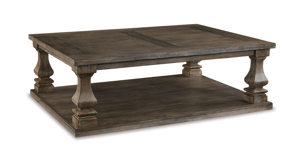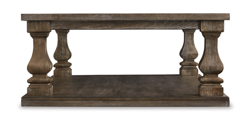 Homey. Hearty. Heavenly hued. Luring with a distressed weathered gray finish and square baluster legs set on a broad lower shelf for great presence, this coffee table is sure to make your homestead feel that much more like home. The look is beautified with elm veneers and a framed and plank-effect tabletop for a richly crafted masterpiece made for years of satisfaction.