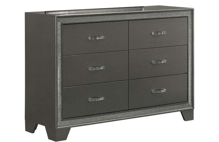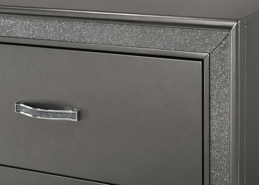 Elevate your bedroom with the perfect storage option using this glamorous dresser. Sparkling drawer handles and embellishments catch your eye and make your room shine, while six spacious drawers provide ample space for all your daily-wear necessities. Clean lines and a dark finish bring a contemporary sophistication to your bedroom ensuring a modern and fresh aesthetic.