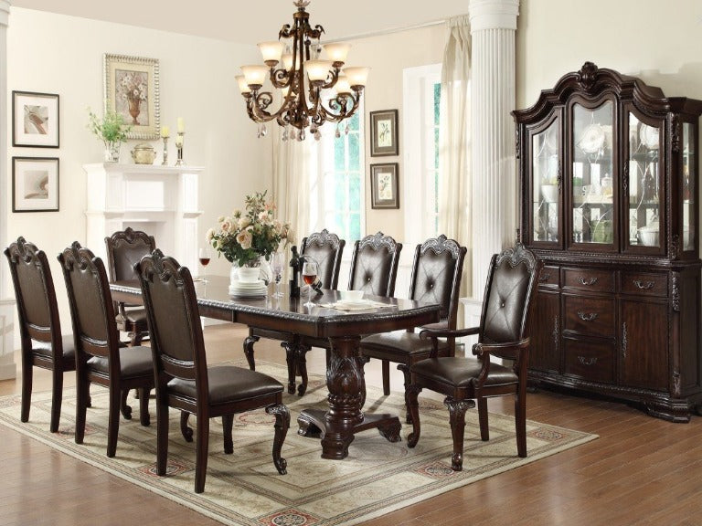 The beautiful Kiera Espresso Arm Chairs carry a very elegant and traditional style that will bring a timeless atmosphere to your home. Exquisite carved details and ornate trims are bathed in a rich brown tone over the select veneers of each piece. Additionally, these arm chairs are padded and upholstered in a dark brown color faux leather to provide you and your guests with luxurious comfort.