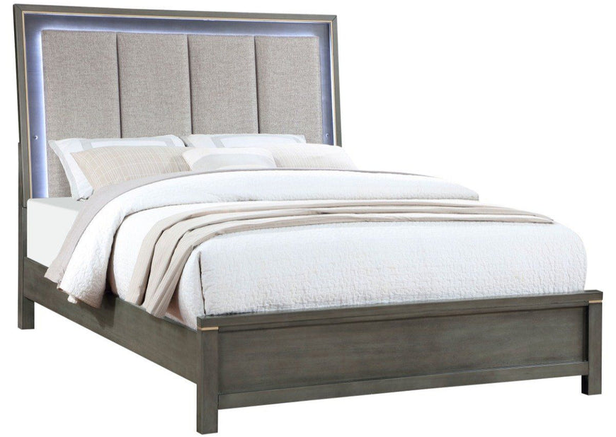 LED mood lighting plays up the modern ambiance of a contemporary wooden bed. Its upholstered headboard features vertical panels with light oyster gray upholstery, trimmed with lights to create an inviting glow in the evening. A soft gray wood finish is a perfect complement, trimming the headboard and gracing sleek rails and a low footboard. Warm brass-toned hardware accents bring stylish flair to each corner of the footboard, and outline the headboard to create a sophisticated finishing touch. Rails and center support legs complete the bed, adding strength and durability.