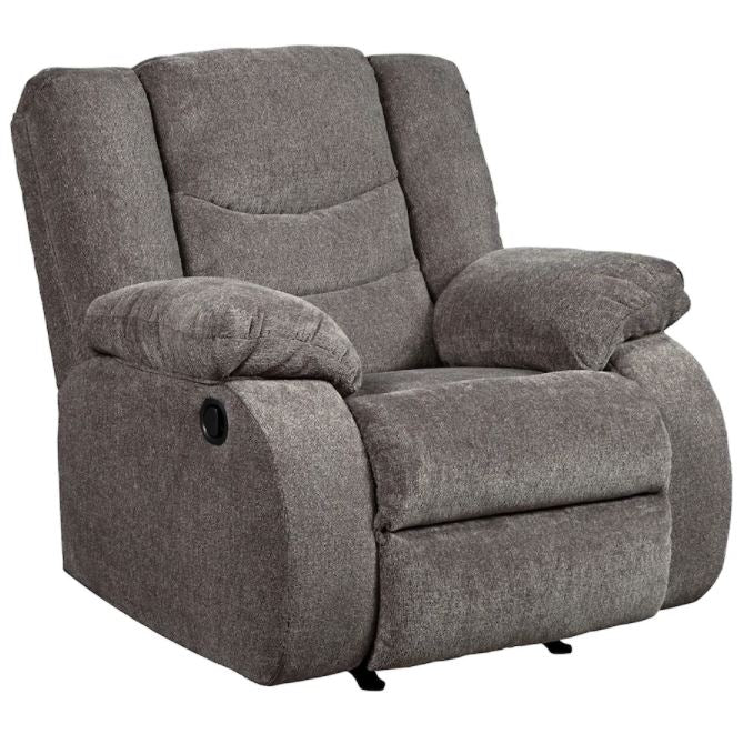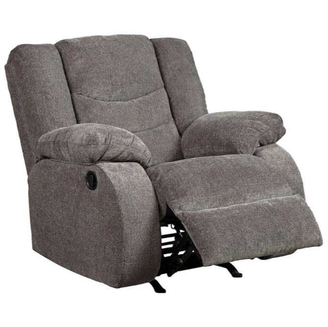 This rocker recliner is designed for ultimate comfort and relaxation. Featuring a waterfall back design and extra-plump pillow top arms, it combines style with coziness. The soft chenille fabric adds a luxurious feel, while the ample seating space ensures you can stretch out and unwind. Whether you're watching a game or reading a book, this recliner offers endless comfort possibilities. Sit back, relax, and enjoy a winning experience with this rocker recliner.