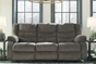 This reclining sofa puts the win in winning. Its waterfall back design and doubly plump pillow top arms team up with soft chenille fabric to go for the goal. An ample seating room makes the comfort possibilities endless. Sit back and relax. You won’t go wrong with these reclining sofas.
