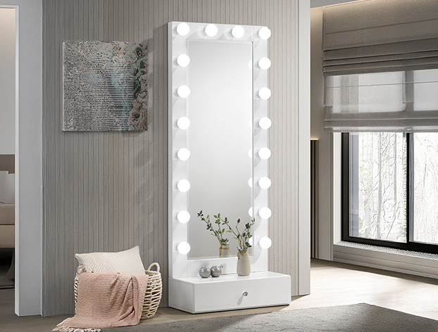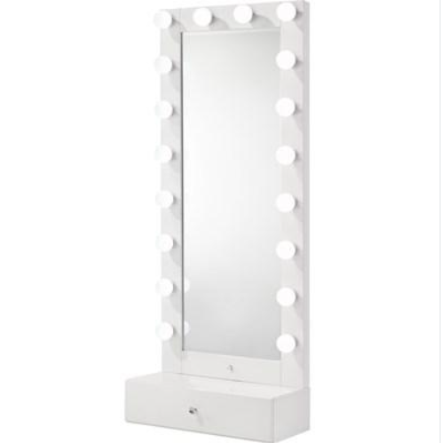Step into a world of glamour with this sleek and chic vanity set, a perfect fusion of functionality and fashion. Its glossy white finish and clean lines are complemented by the sparkle of a crystal-like knob, adding a touch of sophistication to your personal space. The full length mirror is surrounded by radiant lights, while the ample drawer provides storage for essentials. A perfect spot to check your outfit of the day.