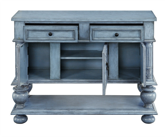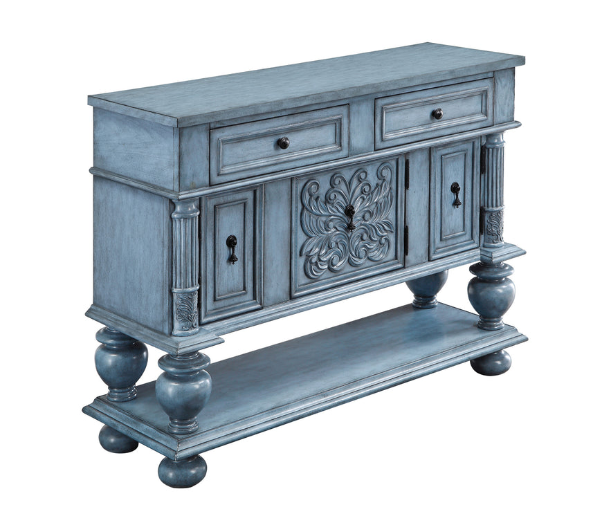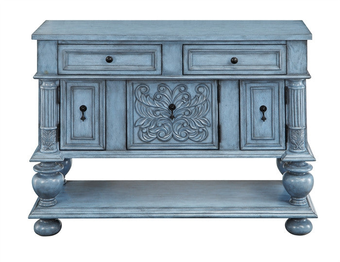 A beautiful storage solution, this console has incredible detail. The focal acanthus element is balanced by intricately-carved ornamental column side supports and four bold urn pedestals atop a full-shelf stretcher base with bun feet. The paneled drawers are fitted with classic knobs while acorn teardrop pulls adorn the paneled doors. A shelf in the center cabinet maximizes space.
