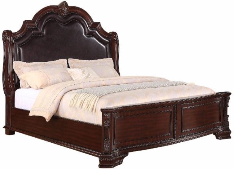 This bed features bracket feet, a leather-like upholstery headboard with nailhead trim, and intricately carved molding details that complete the look of the bed. Transform your master bedroom suite to one of luxury with this traditional style panel bed. It has upholstered headboard panels, stout, bracket legs, and matching side rails.