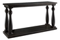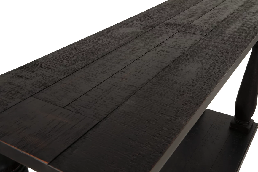 This black sofa table has a dramatic presence—exactly what an eclectically styled room needs. Solid wood planks and thick veneer merge seamlessly together for a hearty helping of style. Handsomely turned legs connect to a lower shelf flush with the floor. A rustic wirebrush technique gives this stunning sofa end...