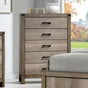 Save bedroom floor space with this contemporary five drawer chest. The sleek chest has a light grey finish, a clean frame, and flat drawer panels. Black metal bar hardware matches the accents on the top corners of the frame. Pair with the bed in this collection for a stylishly refined bedroom set.