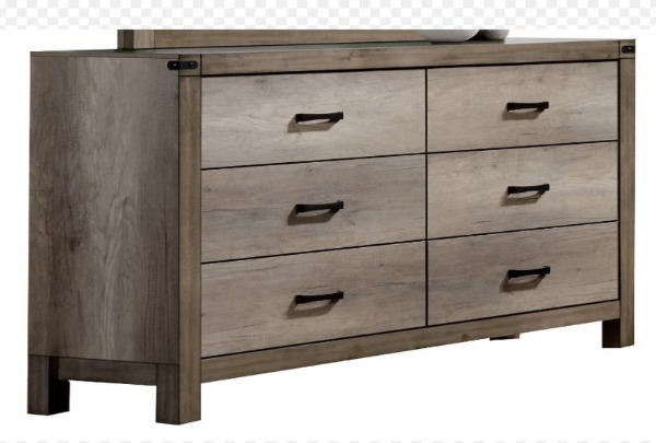 Thi sleek dresser has a light grey finish, a clean frame, and flat drawer panels. This rustic styling dresser features 6 drawers with center metal glides. Black metal bar hardware matches the accents on the top corners of the frame. Pair with the bed in this collection for a stylishly refined bedroom set.