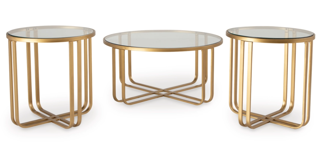 These coffee and end tables set the perfect stage for displaying favorite books, unique trinkets or serving trays. With trendy goldtone frames and clear glass tops, their versatile design effortlessly suits modern interiors. Whether acting as the focal point for a social soiree or a landing spot for your morning coffee, this set of tables makes contemporary living all the more chic.
