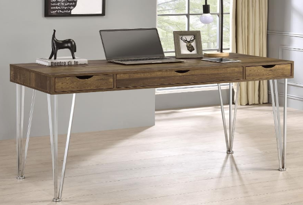 Perfect for a modern farmhouse home office or library comes this classy, yet rustic writing desk. Designed with a neutral rustic brown oak finish throughout the tabletop, this writing desk blends well into many decor styles and color palettes. Its rectangular tabletop shape rests elegantly on chic thin metal legs that lend a retro-inspired flair and an open and airy look. This writing desk also offers plenty of hidden storage space with one long center drawer and two side drawers, each with cutout handles that give a flush, clean look. Each three-pronged steel leg offers a glam touch with a shining electroplated chrome finish.