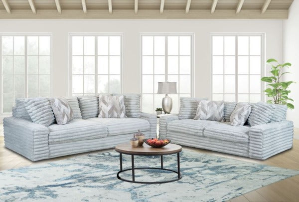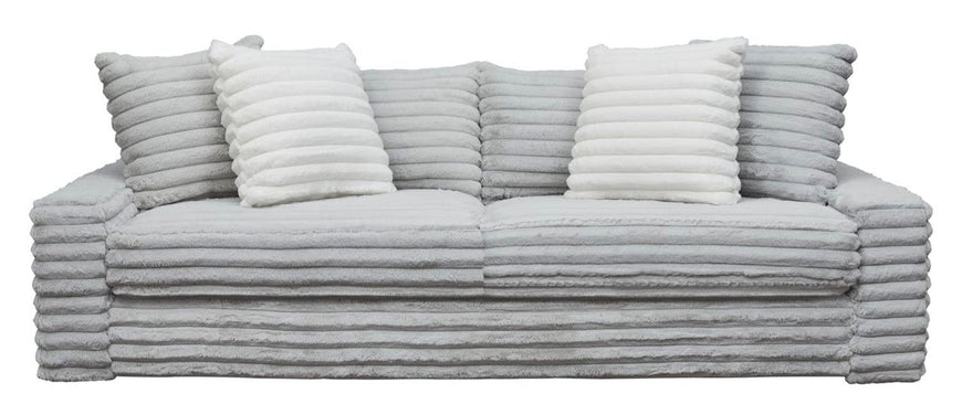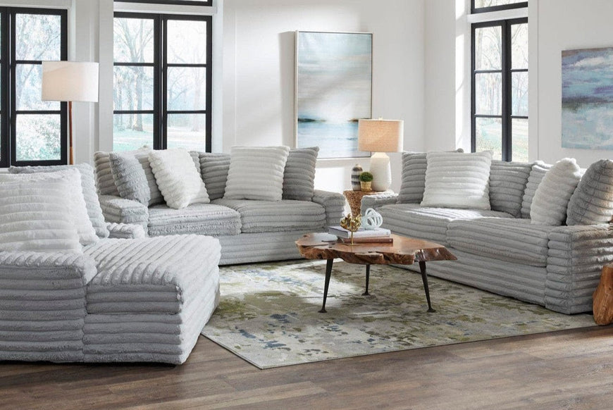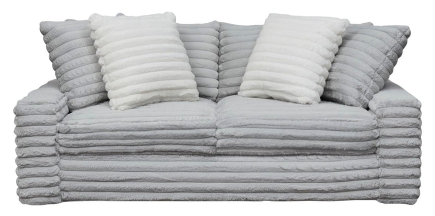 Bold, modern, and…cuddly! The Moon Sofa and Loveseat are ideal places to snuggle up, whether you’re watching TV under a blanket or reading a book beside your partner. This luxe sofa set boasts an irresistible texture courtesy of horizontal channeling and a sumptuous polyester fabric over high-density foam cushions. They’re must-feel pieces of furniture! Moon has a solid foundation, too. That’s because its frame is engineered of wood with 8-gauge sinuous spring seat support, giving this neutral gray sofa set long-lasting strength. Low-profile padded arms add to the clean, linear effect while four matching toss pillows create an extra layer of comfort. Trust us, this luxe sofa set is an ultra-comfy spot to unwind. Complete the look by getting other pieces in the collection!