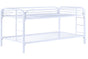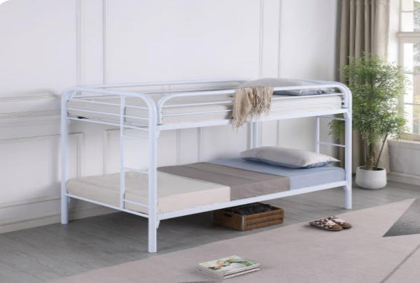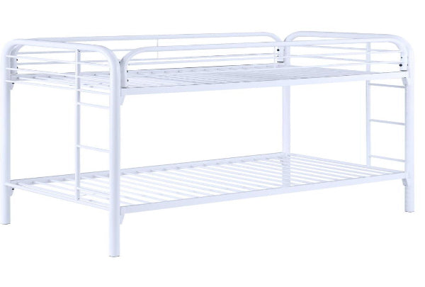 Update a child's room with the elongated lines in this twin bunk bed. The metal frame is open and supportive, with built-in ladders on each side and a full-length guard rail. This twin over twin bed offers a clean feel with its crisp white finish. With straight elongated legs, the silhouette elevates any modern motif. The rounded edges around the top rail add a delicate feel to any small and shared room.