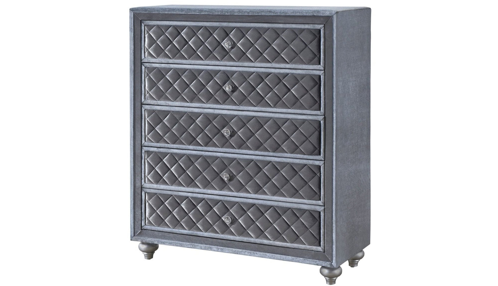 This five drawer bedroom chest radiates elegance. Designed with a beautiful geometric pattern on each drawer face, this chest is ideal for any traditional inspired environment.