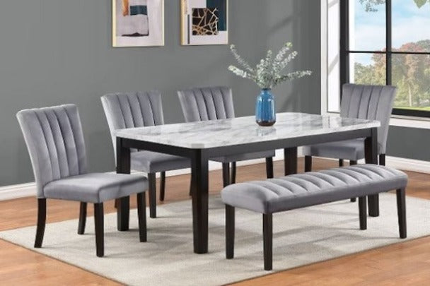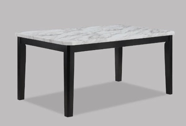 This gorgeous dining table set is a perfect blend of traditional and modern design elements. This table features a stunning faux white marble table top that is both elegant and durable. This upholstered dining chair is a stylish and functional piece of furniture. The black finish on the table and chair legs contrasts beautifully with the white marble-like top, creating a stylish and eye-catching piece of furniture. With this transitional dining set, you can expect a blend of classic elegance and modern functionality in your dining area. It will be perfect for both formal and casual dining settings.