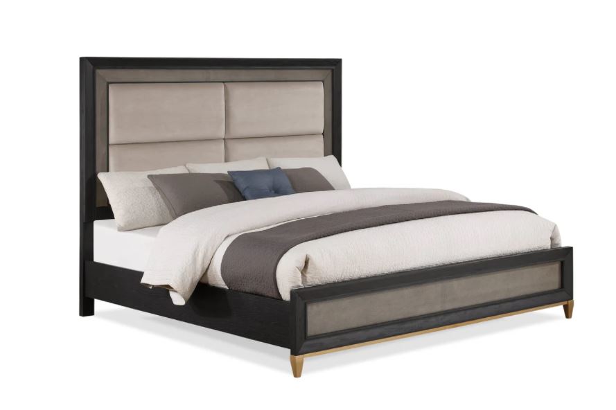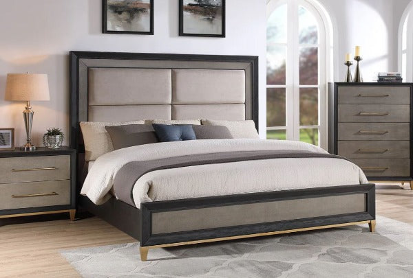 At the heart of the set lies a magnificent bed frame, its robust panel design featuring a plush, upholstered headboard in a serene shade that complements the gray scale of the other pieces. The headboard’s padding promises comfort and support for nights of restful slumber or leisurely reading. The frame itself rests on subtle legs, with gold accents that reflect a keen eye for detail.