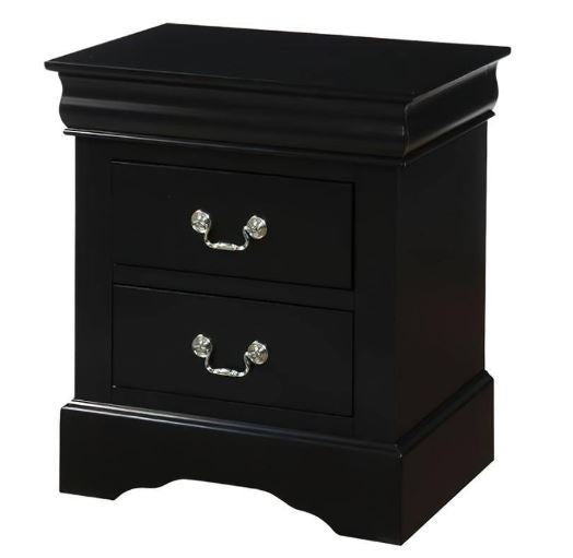 The Philip Black Nightstand is an enchanting addition to your sleeping space. Made with select hardwoods and a black finish, this piece is warm and matches well with any décor. This piece has beautiful features such as simple molding at the top, metal bail handles and bracket feet