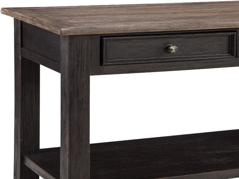 Shabby chic with a hint of down home country. The Tyler Creek sofa table with textured black finish is all the talk of today’s design world. Wood grain shows through the weathered gray-brown top in all of its earthy pleasure. Framed drawers are adorned with lovely traditional hardware. Smooth pull-out makes it easy for you to store away your belongings in style.