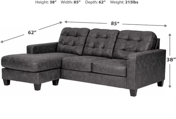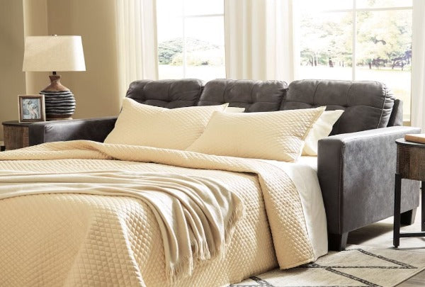 This ultra-contemporary sofa sleeper invites you to spread out and make yourself comfortable. Linear track arms offer a clean, sleek aesthetic, while tufted box cushions are a nod to mid-century design. Rest assured, a movable ottoman and reversible seat cushions allow you to place the chaise on either side for the perfect fit. Gunmetal gray faux leather offers the cool, weathered look you love and the touchably soft feel you crave. Pull-out queen mattress in quality memory foam comfortably accommodates overnight guests.