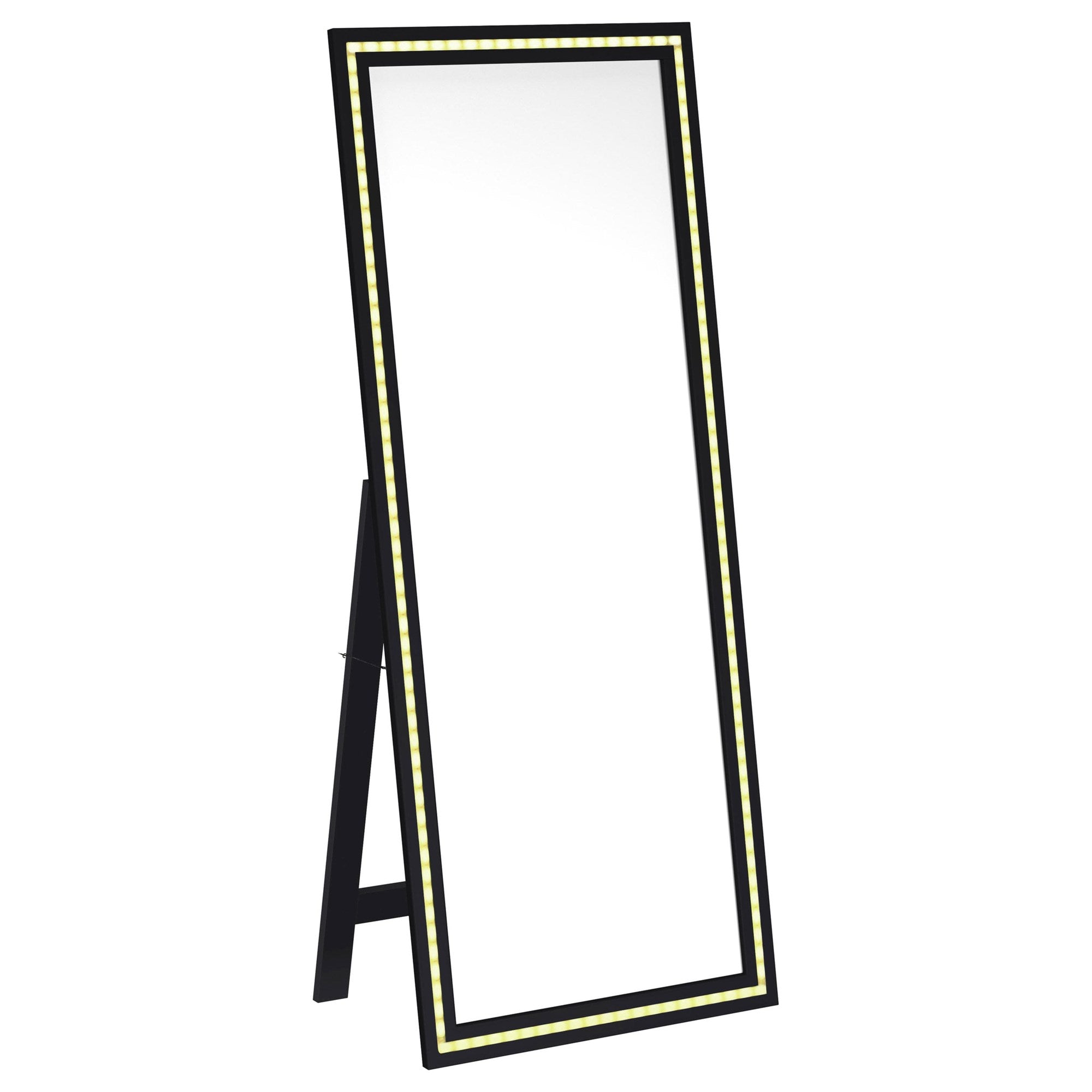 Dress up a dressing area or seating group with the glamour of a modern floor mirror. The full-length design features a decorative frame complete with a support leg or its freestanding, perfect for defining an open living space or offering dimension elsewhere in your home. The mirror includes LED lighting, creating an inviting ambiance while providing light perfect for selecting jewelry or choosing your outfit. It features a neutral finish with silver trim that gleams in the light, creating a sense of depth and dimension. Choose the perfect spot for this freestanding floor mirror.